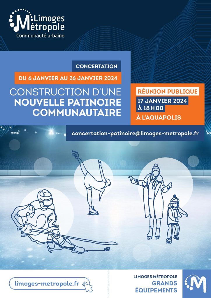 La Ville de Limoges envisage de fermer la patinoire olympique (Boulevard des Petites Carmes) et cherche à inscrire, au Projet de Territoire de Limoges Métropole, la création d’une nouvelle patinoire communautaire. L’objectif est de disposer d’un équipement sportif et ludique moderne, adapté aux attentes en termes de loisirs et de compétitions, répondant aux normes et… Lire la suiteProjet patinoire Limoges Métropole : concertation publique du 6 au 26 janvier 2024