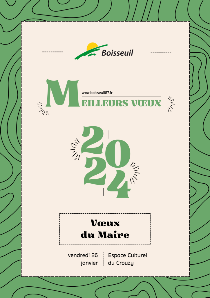 Le conseil municipal vous adresse ses meilleurs vœux et vous invite, le vendredi 26 janvier 2024 dès 19h, à la cérémonie annuelle des vœux du maire de Boisseuil organisée à l’espace culturel du Crouzy !… Lire la suiteMeilleurs vœux 2024 !