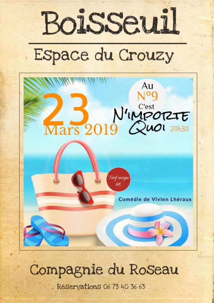 Sam 23 mars 20h30: comédie policière de 2h avec entracte et buvette, jouée par la troupe adulte de la Compagnie du Roseau : ‘’Au n°9 c’est n’importe quoi’’ de Vivien Lhéraux. Tarif 6€ .