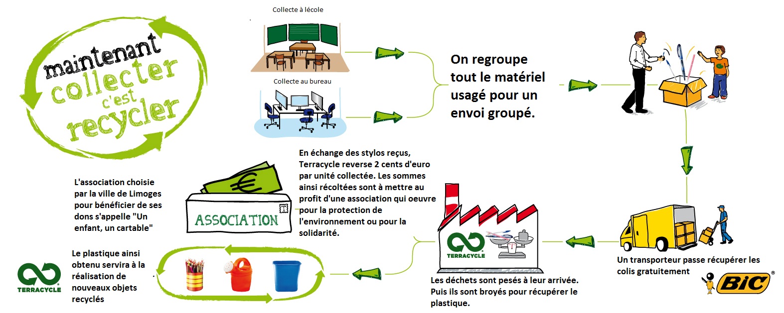 En échange des stylos reçus, Terracycle reverse 2 centimes d’Euros par unité collectée à une association de solidarité ou d’environnement, au choix de l’initiateur.
