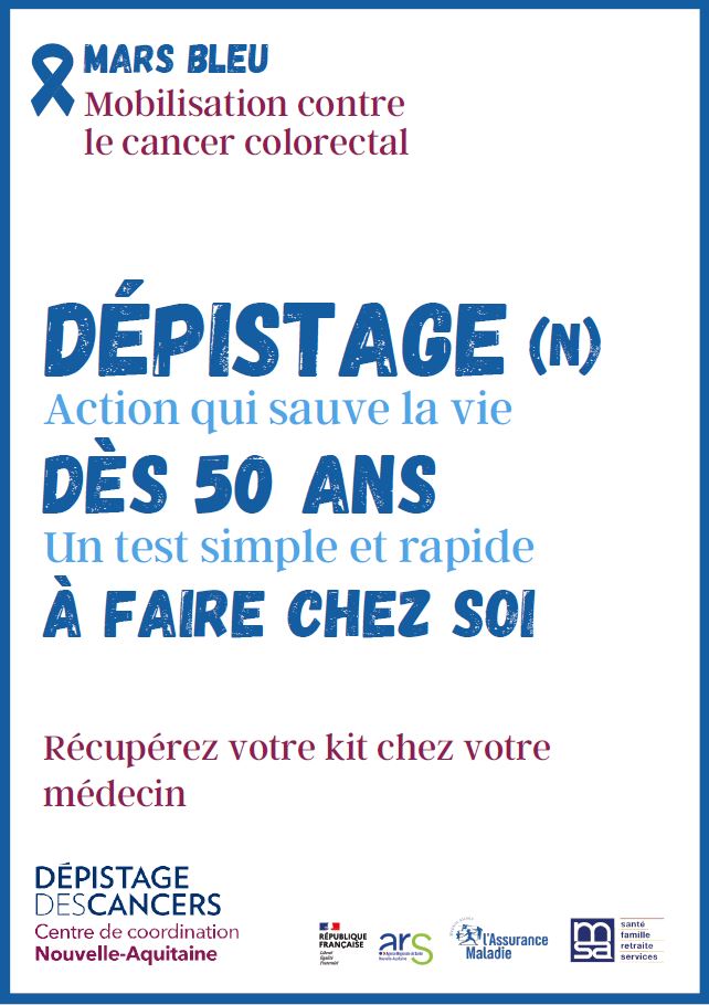 MARS BLEU Le mois du dépistage du cancer colorectal PREVENIR ET DEPISTER POUR SAUVER DES VIES Centre de Dépistage des Cancers de Haute-Vienne : 05.55.00.05.33 février 22, 2022 Publié dans Actualités