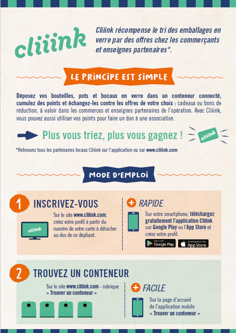 Cliiink est une technologie innovante développée par l’entreprise Terradonna pour récompenser le geste de tri des usagers et améliorer par conséquent les performances de tri du verre. L’usager se connecte à l’équipement grâce à son smartphone ou une carte dédiée à cette application. Chaque bouteille, pot ou bocal en verre déposé incrémentera le compte de l’usager d’un point. Le cumul des points se transformera in fine en bons d’achats auprès des commerçants partenaires de l’opération ou en dons à des associations.