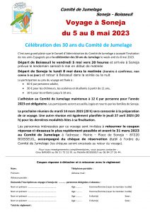 Vous souhaitez faire partie du groupe qui se déplacera à Soneja (Espagne) le week-end du 8 mai 2023 et participer au 30ème anniversaire du jumelage entre Boisseuil et Soneja ?