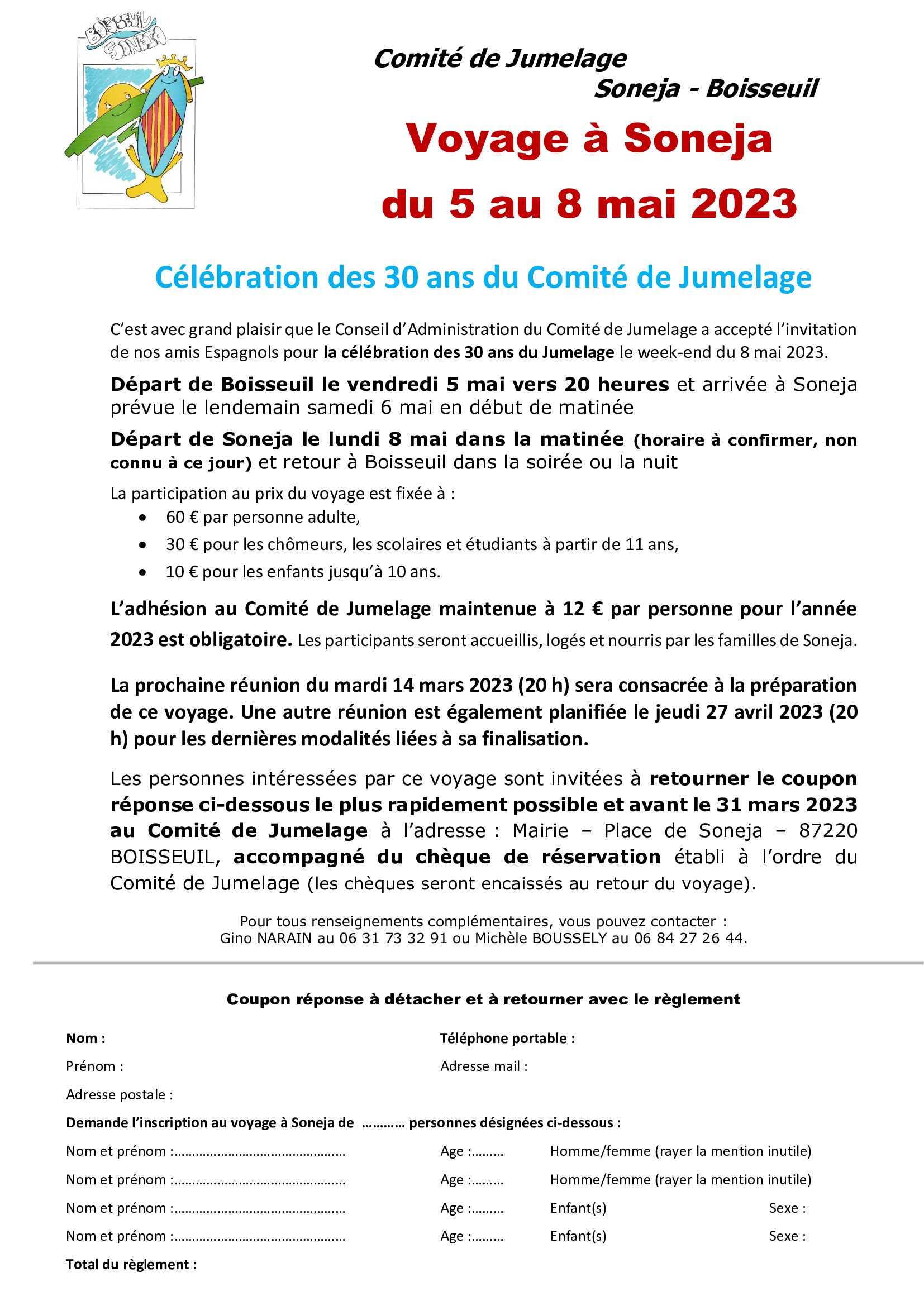 Le tout est à adresser par courrier à l’adresse : Comité de Jumelage Soneja – Boisseuil – Mairie de Boisseuil – Place de Soneja – 87220 BOISSEUIL.