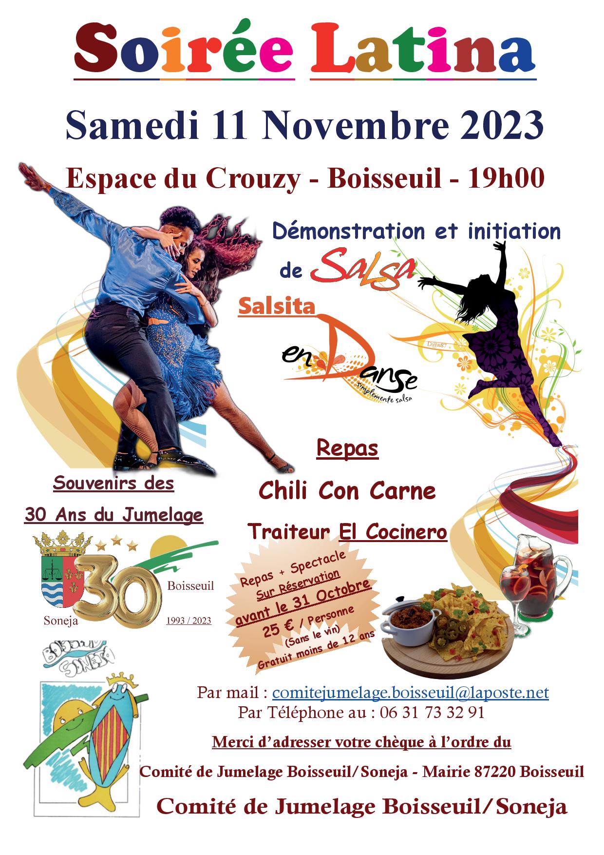 Le Comité de Jumelage organise le samedi 11 novembre une soirée Latina à partir de 19h à l’espace culturel du Crouzy.