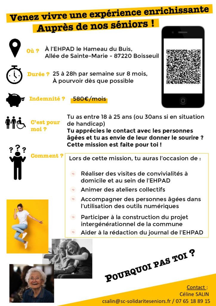 Offre de service civique – EHPAD Boisseuil … Lire la suite Offre de service civique – EHPAD Boisseuil avril 22, 2022 Publié dans Actualités