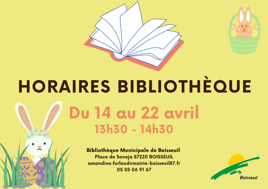 Modification horaires bibliothèque … Lire la suite Modification horaires bibliothèque avril 14, 2022 Publié dans Actualités