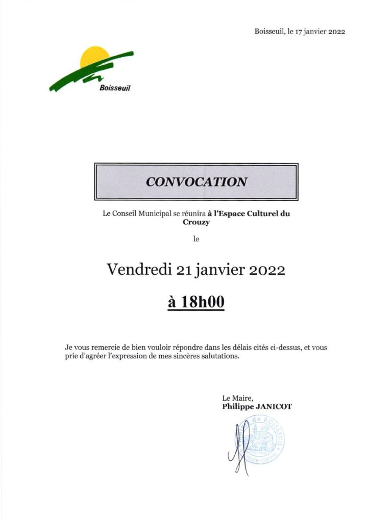 Convocation Conseil municipal du 21 janvier 2022 … Lire la suite Convocation Conseil municipal du 21 janvier 2022 janvier 25, 2022 Publié dans Actualités