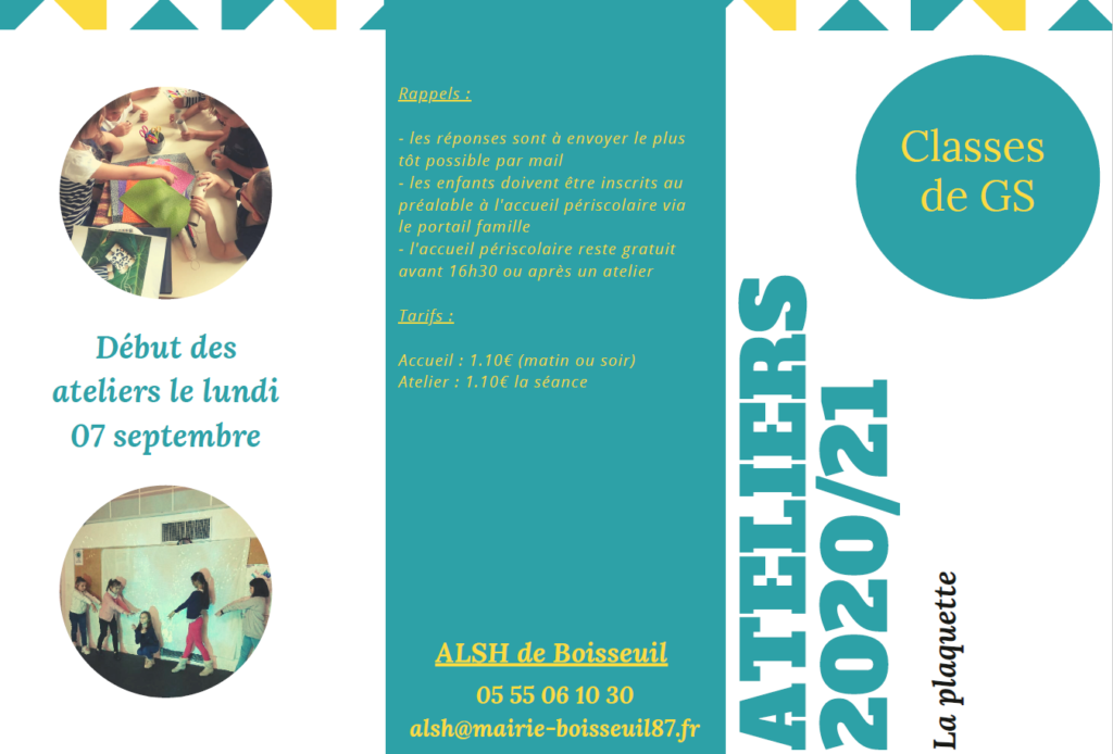 Les inscriptions pour les ateliers périscolaires qui commenceront le 7 septembre 2020 sont ouvertes par mail : alsh@mairie-old-boisseuil87.unova-dev.fr
