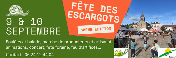 Fête des escargots : 9 et 10 septembre … Lire la suite Fête des escargots : 9 et 10 septembre août 16, 2023 Publié dans Actualités