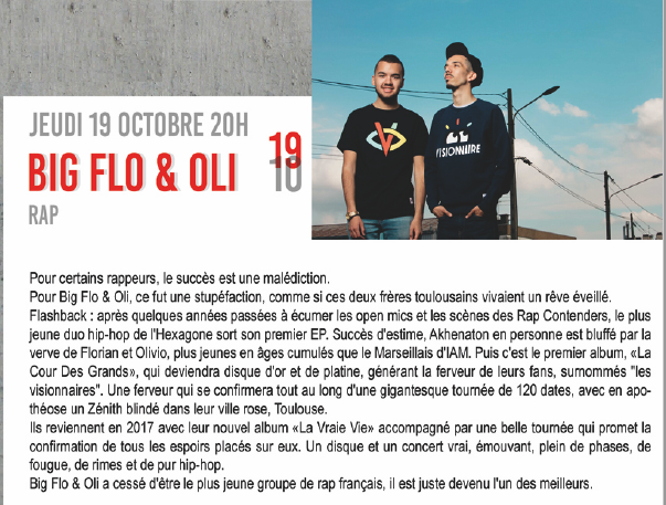 Pour des raisons techniques le concert de Bigflo et Oli se déroulera à Feytiat salle Georges Brassens… Lire la suiteBIG FLO ET OLI CONCERT DÉPLACÉ A FEYTIAT
