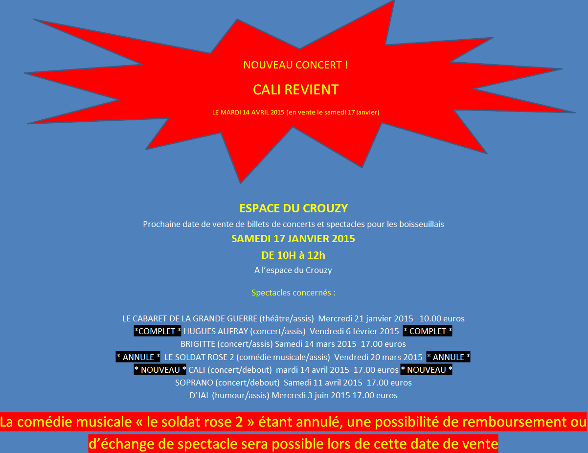 La prochaine prévente de billets de spectacles pour les Boisseuillais à l’Espace du Crouzy aura lieu le 21 mars 2015