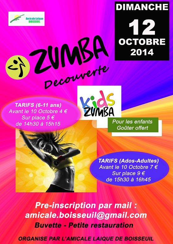 Cette manifestation aura lieu le dimanche 12 octobre 2014 de 14h30 à 16h45. Elle comprend un cours de « Zumba Kids » (+ goûter offert) destiné aux enfants entre 6 et 12 ans et un cours pour les adultes.